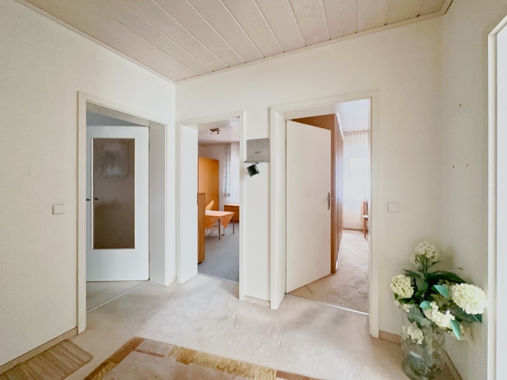 Bereits beim Betreten der Wohnung heißt Sie der einladende, weitläufige Flur willkommen. Er bietet nicht nur ausreichend Stellfläche für eine Garderobe, sondern schafft durch seine Größe ein offenes und angenehmes Entrée, von dem aus Sie sämtliche Wohnräume sowie das Badezimmer bequem erreichen.