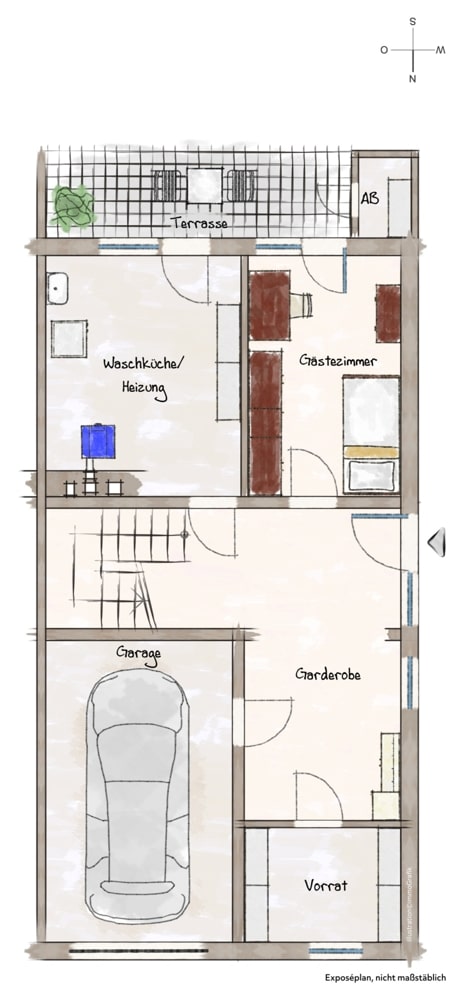 Die in den Grundrissen eingezeichneten Einrichtungsgegenstände, sowie die Immobilienfotos im Exposé dienen lediglich dem Nachweis der Stellmöglichkeit bzw. sind Beispielmöblierungen und sind nicht Bestandteil der Leistung.