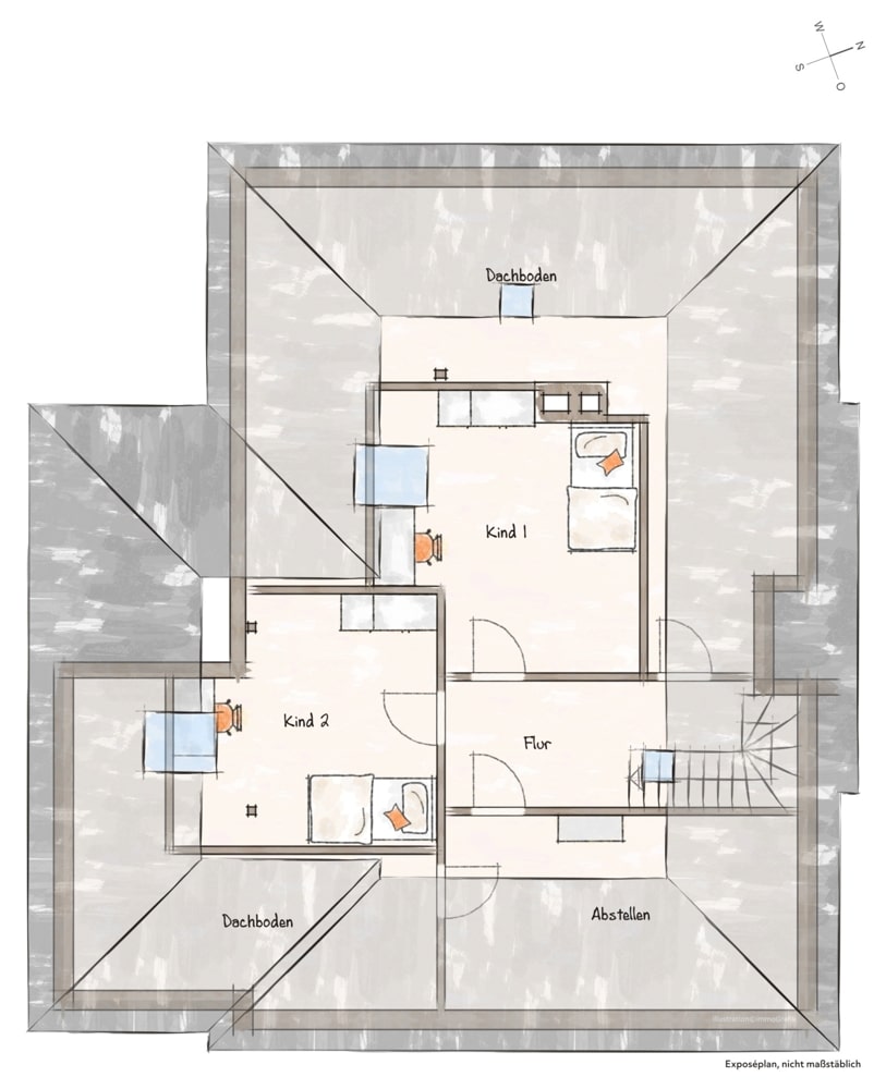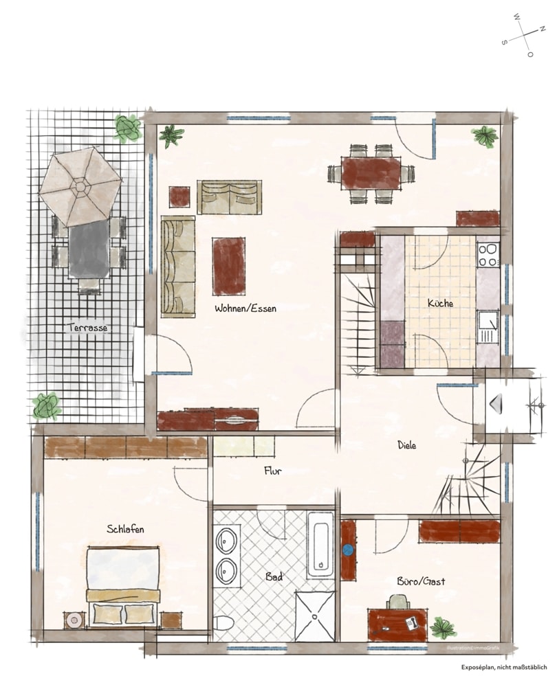Die in den Grundrissen eingezeichneten Einrichtungsgegenstände, sowie die Immobilienfotos im Exposé dienen lediglich dem Nachweis der Stellmöglichkeit bzw. sind Beispielmöblierungen und sind nicht Bestandteil der Leistung.