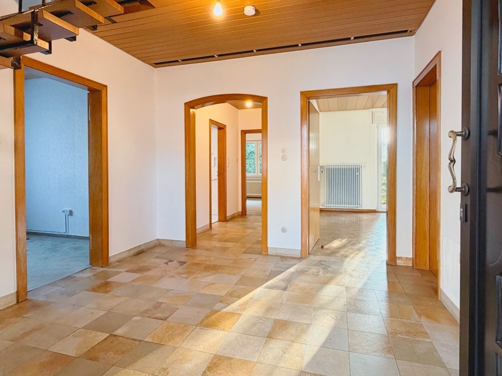 Das Einfamilienhaus überzeugt durch eine klassische Raumaufteilung mit zentraler Diele. Von hier aus sind ein flexibel nutzbares Zimmer (Gäste/Office), das Tageslichtbad mit Wanne, Dusche und Doppelwaschbecken, das Elternschlafzimmer, die Küche sowie das großzügige Wohnzimmer zugänglich.