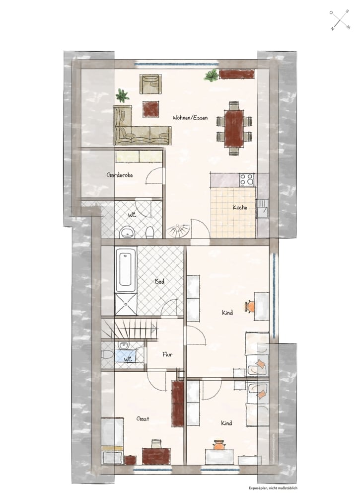 Die in den Grundrissen eingezeichneten Einrichtungsgegenstände, sowie die Immobilienfotos im Exposé dienen lediglich dem Nachweis der Stellmöglichkeit bzw. sind Beispielmöblierungen und sind nicht Bestandteil der Leistung.