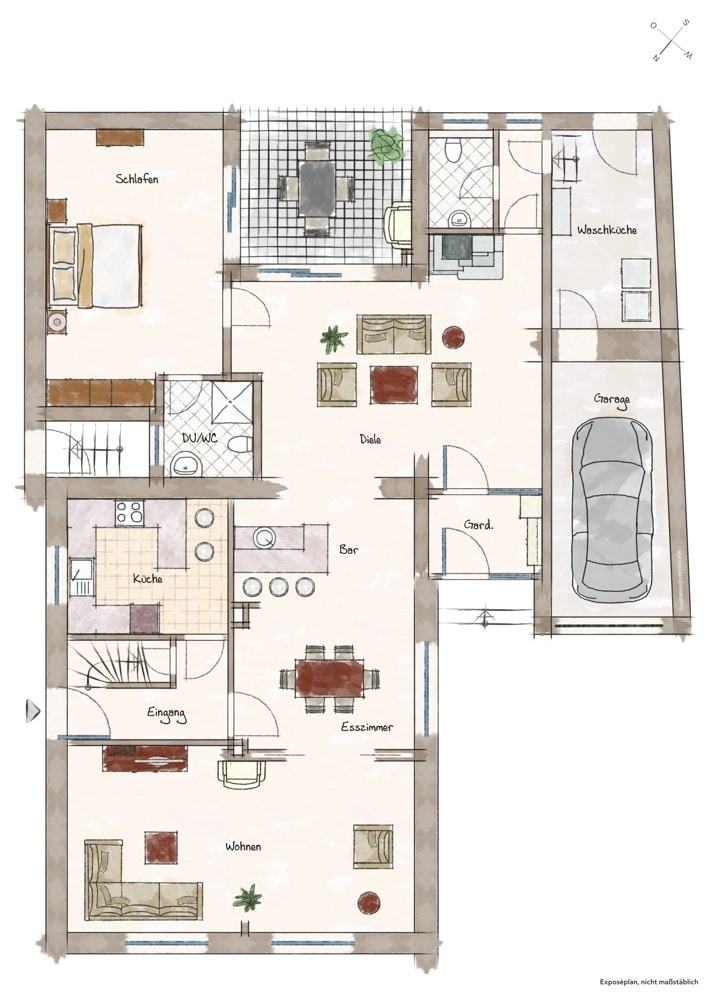 Die in den Grundrissen eingezeichneten Einrichtungsgegenstände, sowie die Immobilienfotos im Exposé dienen lediglich dem Nachweis der Stellmöglichkeit bzw. sind Beispielmöblierungen und sind nicht Bestandteil der Leistung.