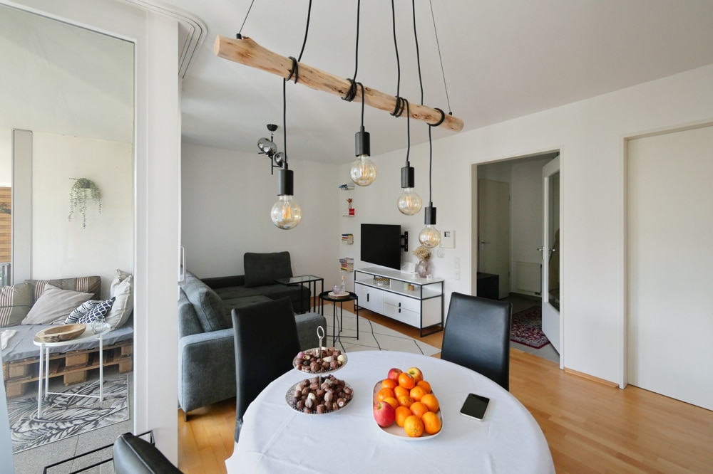 Auf ca. 57 m² Wohnfläche präsentiert sich die Wohnung hell und einladend. Der großzügige Wohn- und Essbereich mit bodentiefen Fenstern schafft eine angenehme Wohnatmosphäre und ermöglicht den direkten Zugang zur überdachten Loggia – perfekt zum Entspannen im Freien.