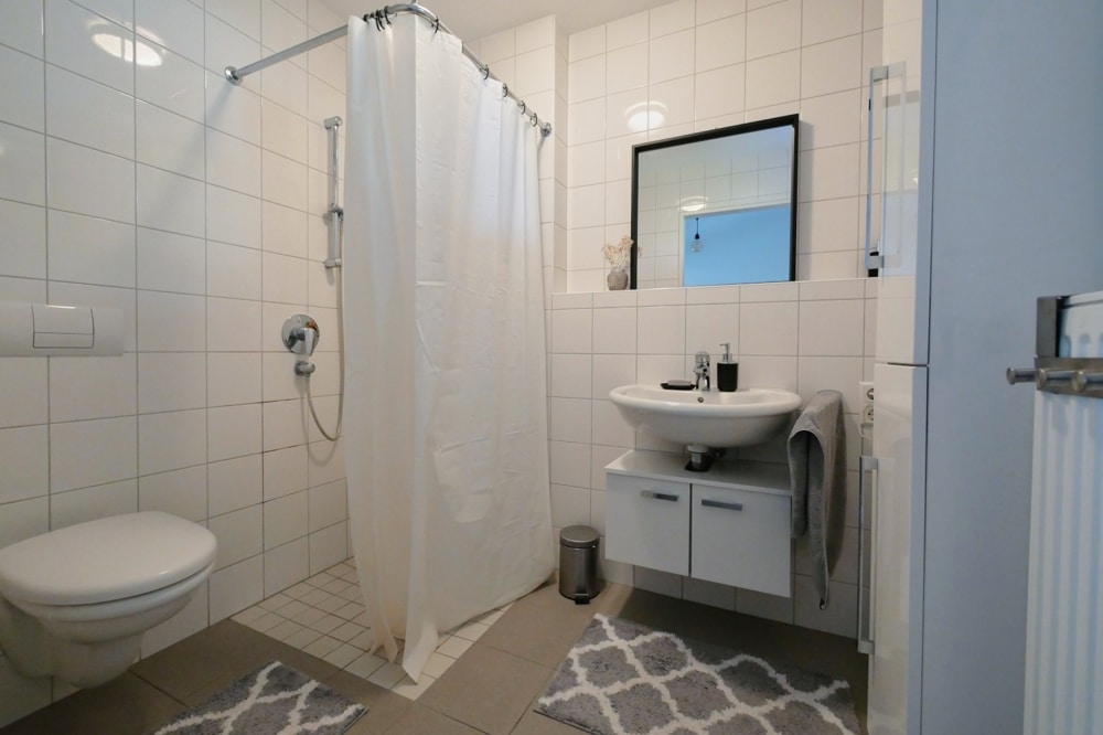 Das moderne Tageslichtbad ist mit einer Dusche und einem praktischen Badezimmerschrank ausgestattet und rundet das stimmige Wohnkonzept ab.
