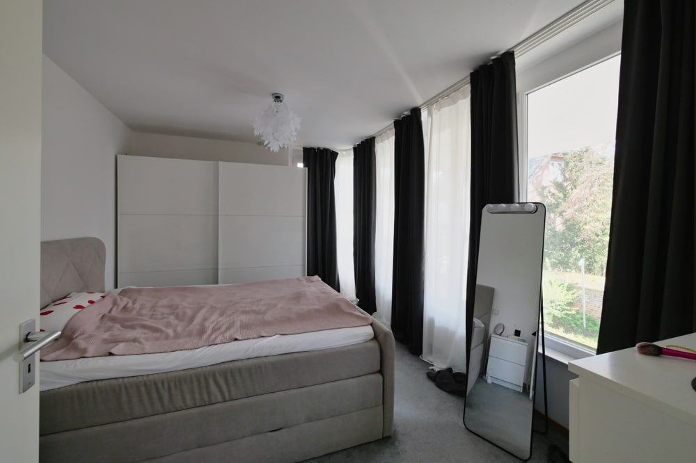 Das helle Schlafzimmer überzeugt mit einem großen Eckfenster, das für ein luftiges Raumgefühl und eine freundliche Stimmung sorgt.
