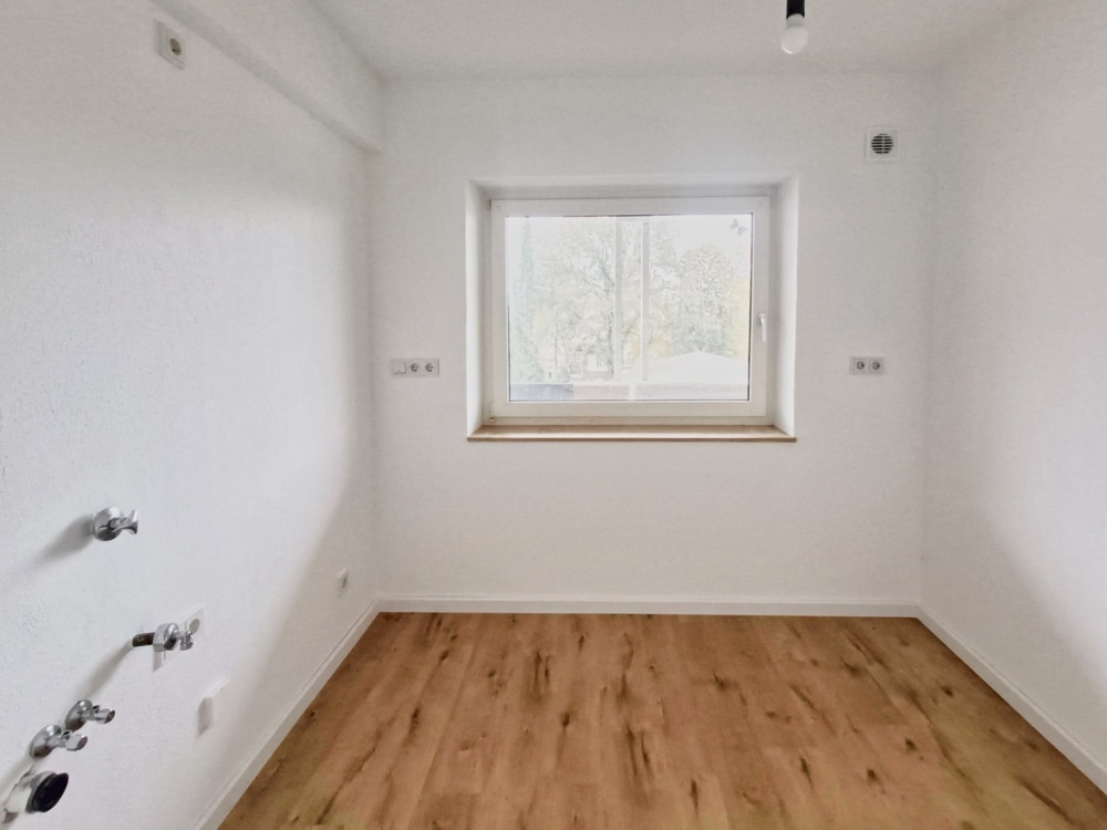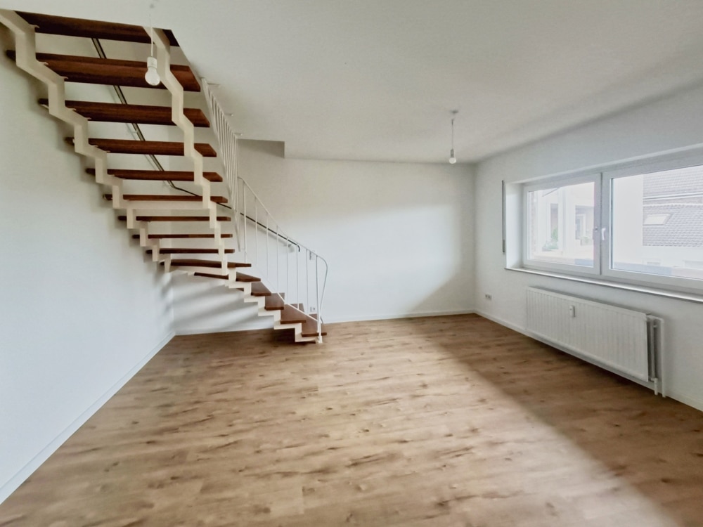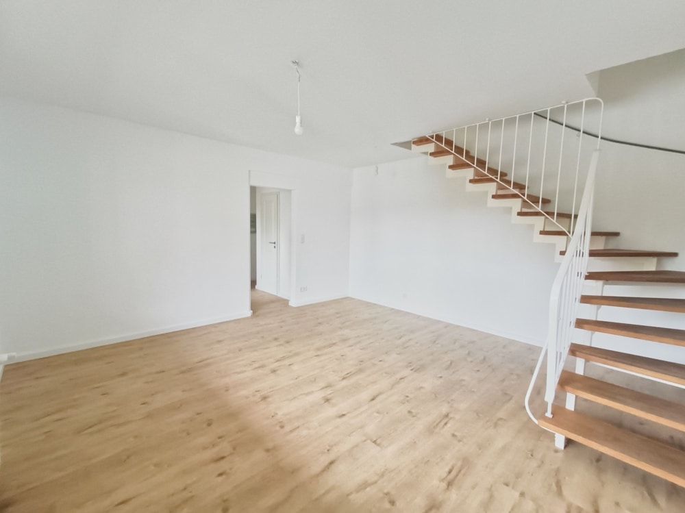 1. Ebene: Eingangsbereich mit kleinem Flur und Platz für eine Garderobe, Gäste-WC, Küche (ohne Einbauküche) mit Fenster zum Laubengang. Großer heller Raum mit großem Fenster und Treppe zu den weiteren Zimmern. Der Durchgangsraum mit Treppe zu den weiteren Zimmern bietet ausreichend Platz für ein gemütliches Esszimmer und verbindet funktional beide Etagen.