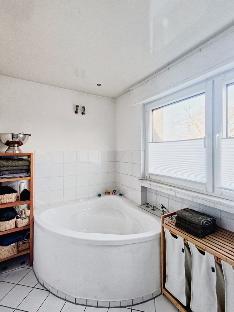 Das große helle Badezimmer ist mit einer Eckbadewanne, einer Dusche und einem Waschtisch ausgestattet.