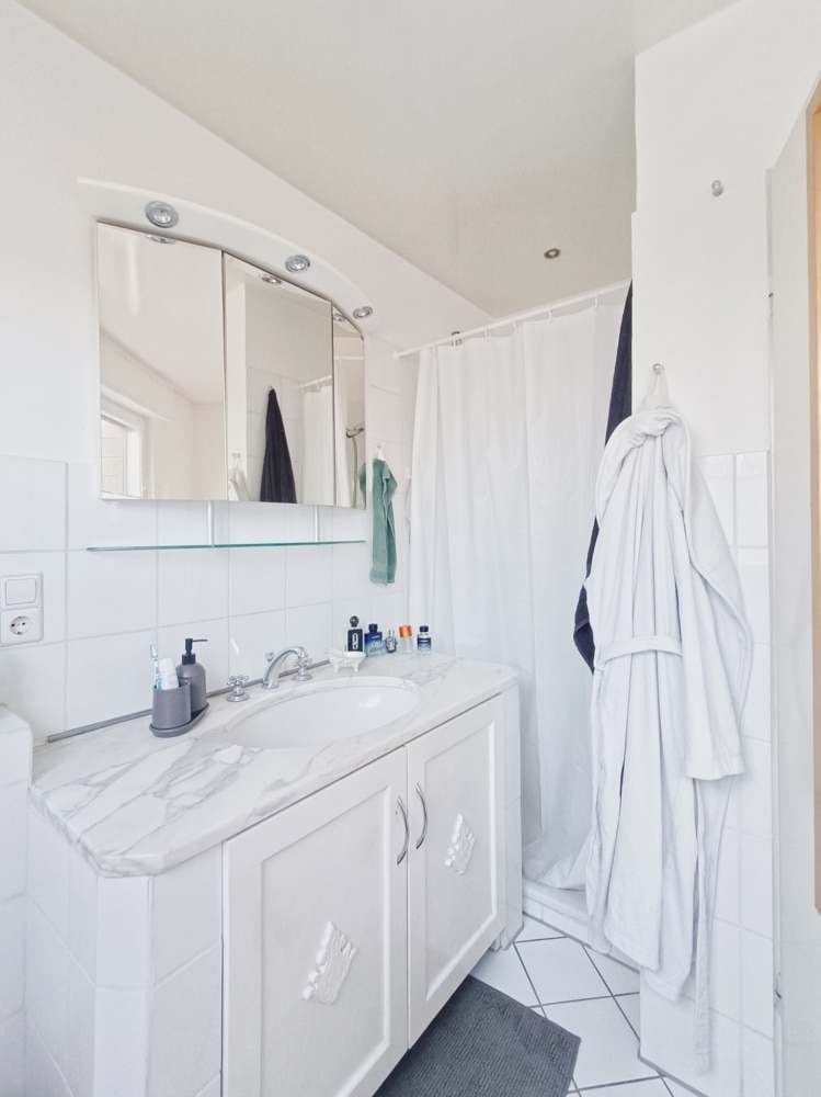 – Bad, weiß gefliest, Eckbadewanne und Dusche