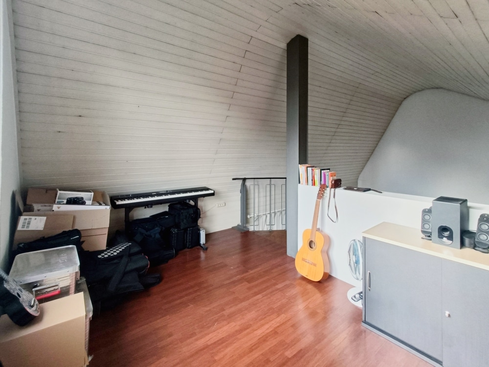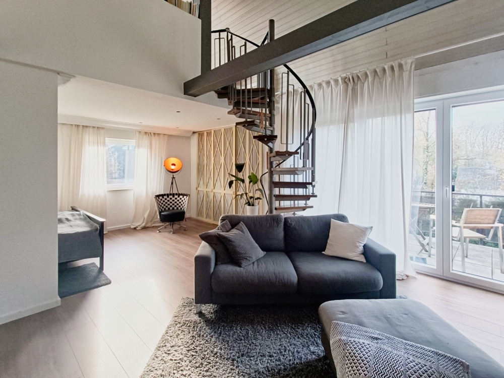 Die Wohnung verfügt über eine offene Galerie, die dem Wohnraum eine besondere Großzügigkeit und Wohnatmosphäre verleiht. Die Empore ist über eine Wendeltreppe erreichbar und vielseitig nutzbar – ideal als gemütlicher Schlafbereich, Homeoffice, Leseecke oder zusätzlicher Rückzugsort. Ein großes Giebelfenster bietet zudem viel Licht.