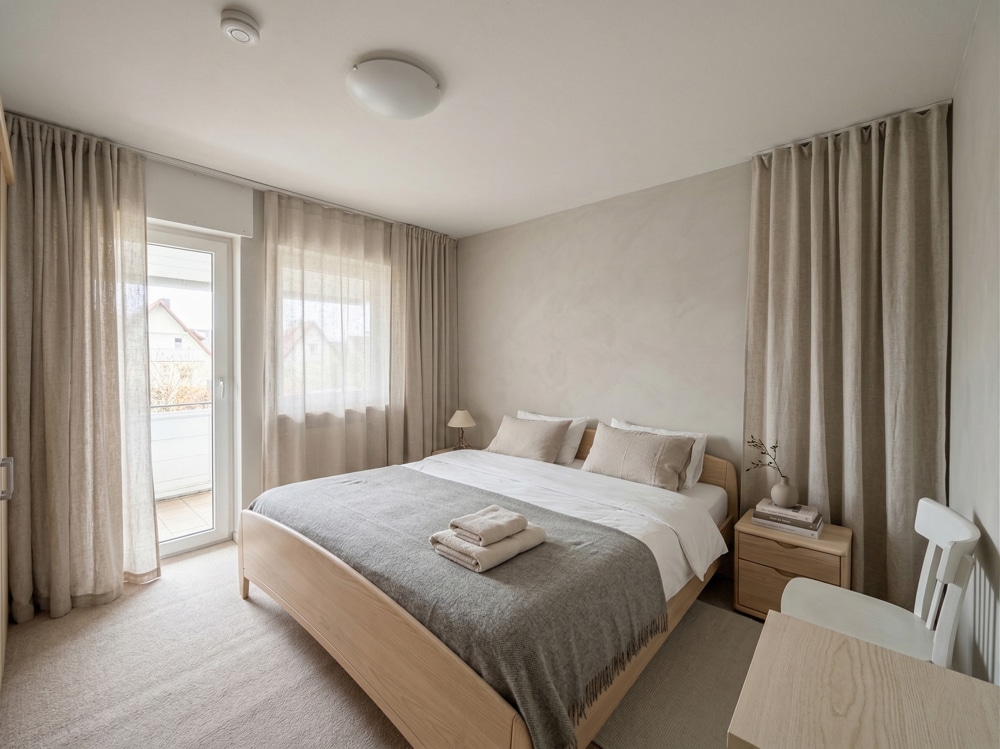 Über eine stilvolle, geschwungene Betontreppe gelangen Sie ins Obergeschoss. Hier erwartet Sie ein ruhiges Elternschlafzimmer mit direktem Zugang zu einem großen, überdachten Balkon – Ihr persönlicher Rückzugsort im Freien. Ergänzt wird die Etage durch ein Kinderzimmer, ein Büro sowie ein Badezimmer mit Badewanne.