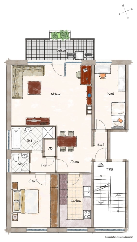 Die in den Grundrissen eingezeichneten Einrichtungsgegenstände, sowie die Immobilienfotos im Exposé dienen lediglich dem Nachweis der Stellmöglichkeit bzw. sind Beispielmöblierungen und sind nicht Bestandteil der Leistung.