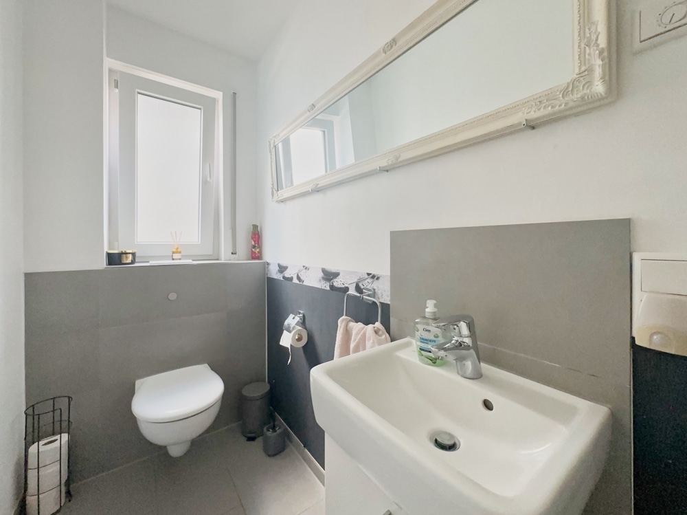 Großzügig geschnitten mit Fenster, Badewanne, & bodengleicher Dusche – hell, modern und hochwertig ausgestattet. Das WC ist separiert.