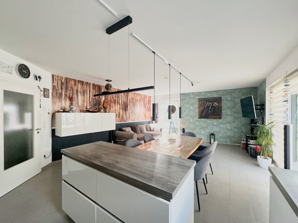 Der offene Wohn-/Essbereich ist das Herzstück der Wohnung. Bodentiefe Fenster sorgen für viel Tageslicht und einen schönen Ausblick in den Garten. Die offene Küche fügt sich harmonisch ein und bietet genug Raum für Kochen und Kommunikation. Der direkte Zugang zur teils überdachten Terrasse schafft fließende Übergänge zwischen innen und außen.